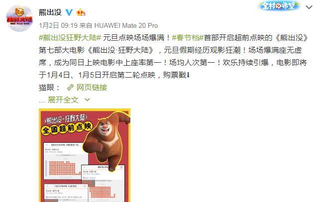 今年,在推出常规预热物料外,也有几部电影抢先一步与观众见面。2020年1月1日,熊出没系列第7部《熊出没 狂野大陆》率先开启了全国点映,并收获了不错的评价,据电影专资办数据,截至16日17时,累计票房已达3580万。